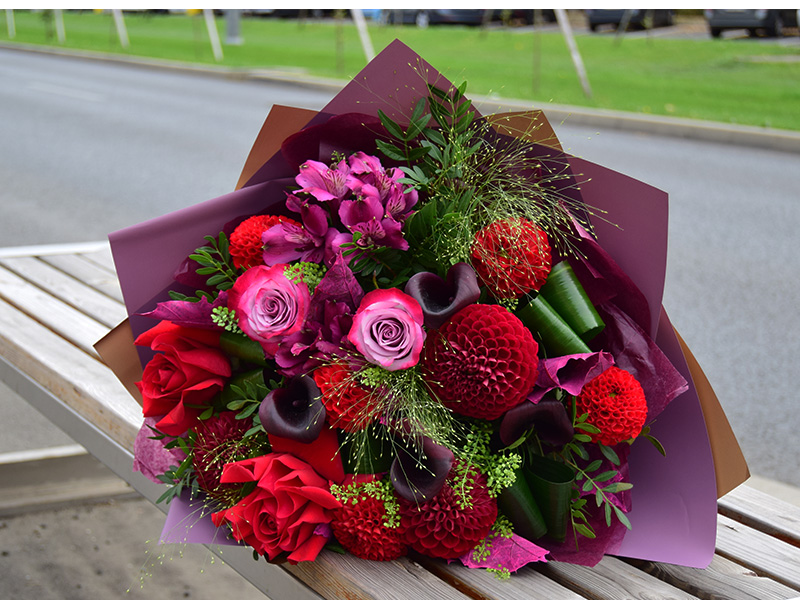 Dominat de eleganța atemporală a trandafirilor, buchetul este îmbogățit cu formele arhitecturale ale calelor și cu splendoarea bogată a daliilor. Fiecare floare este o piesă de catifea a naturii.