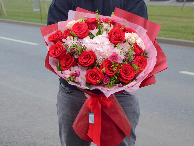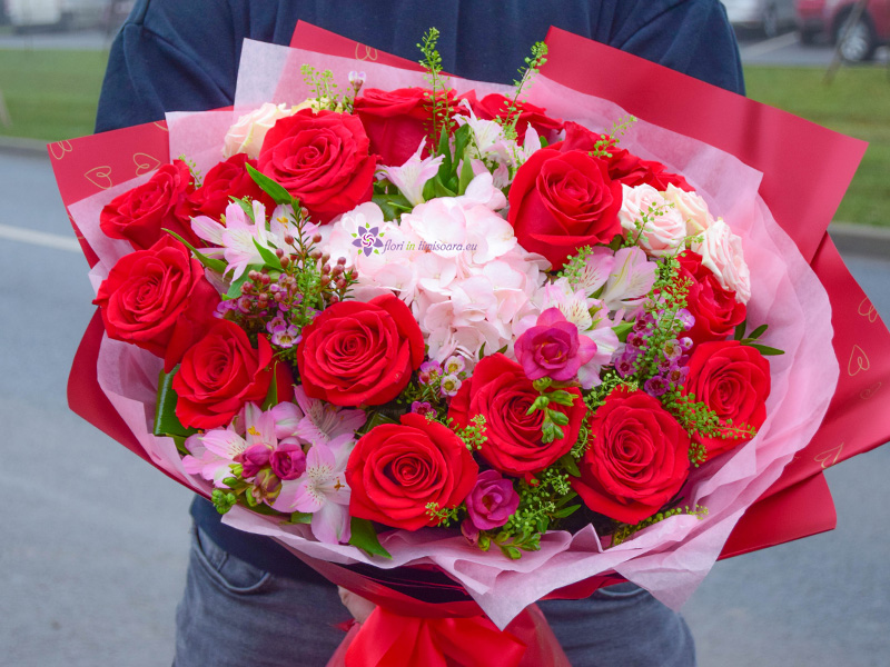 Fiecare floare din acest aranjament generos a fost aleasă pentru a spune o parte din povestea voastră: pasiunea aprinsă a trandafirilor, tandrețea hortensiei și bucuria firelor de alstroemeria roz sunt cadoul perfect pentru a-i aminti că ea este muza ta și că fiecare zi alături de ea este o sărbătoare a frumosului.